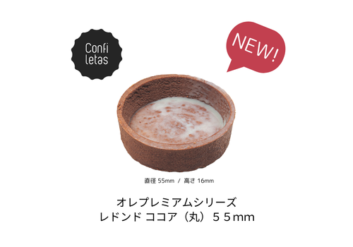 この度、コンフィレタス社のオレプレミアムシリーズ1アイテムを新たに発売する運びとなりましたので、ご案内いたします。風味豊かで甘みを抑えたココア生地のオレプレミアムレドンド ココア(丸)に新しいサイズ 55mmが加わりました。55mmはアフタヌーンティー、スイーツビュッフェにはもちろん、ショーケース用の生菓子におすすめのサイズです。