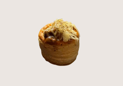 (1)タルト生地(オレプレミアム レドンド(丸)大)にフランジパーヌピスタチオを10g絞る。