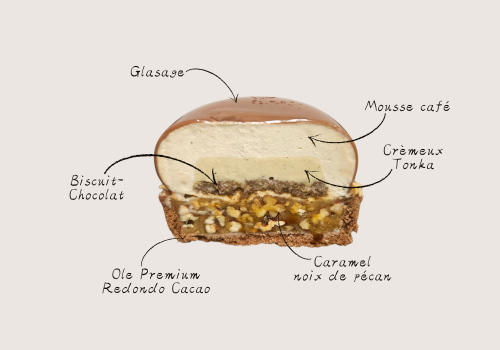 3. グラサージュをかけたムースをキャラメルピーカンナッツを詰めたタルトの上に乗せる。