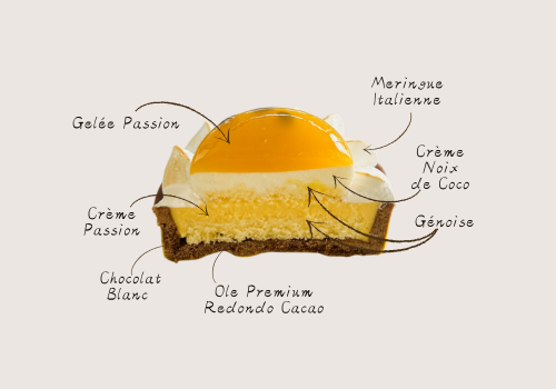 1. 下半分を黄色のショコラブランにくぐらせたオレプレミアムレドンドココアに、5mmにスライスしたジェノワーズを詰め、