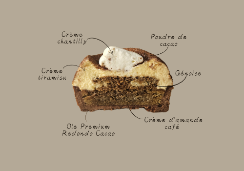 1. ダマンドを入れて焼成したオレプレミアムレドンドココアに、アンビベしたジェノワーズ(5mm)を乗せる。