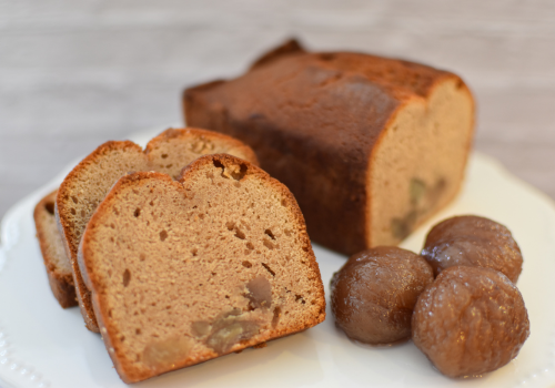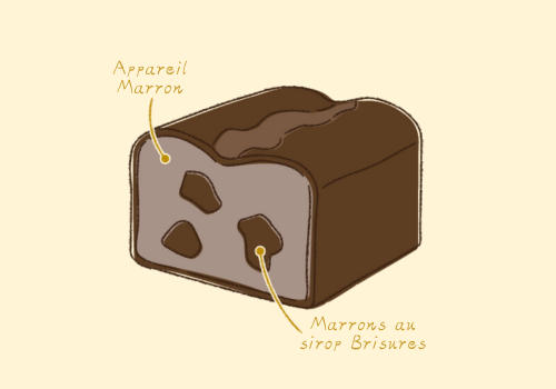 ⑥ シリコンペーパーを敷いた型に生地の半量を流し入れ、マロンインシロップブリジュアを散らす。